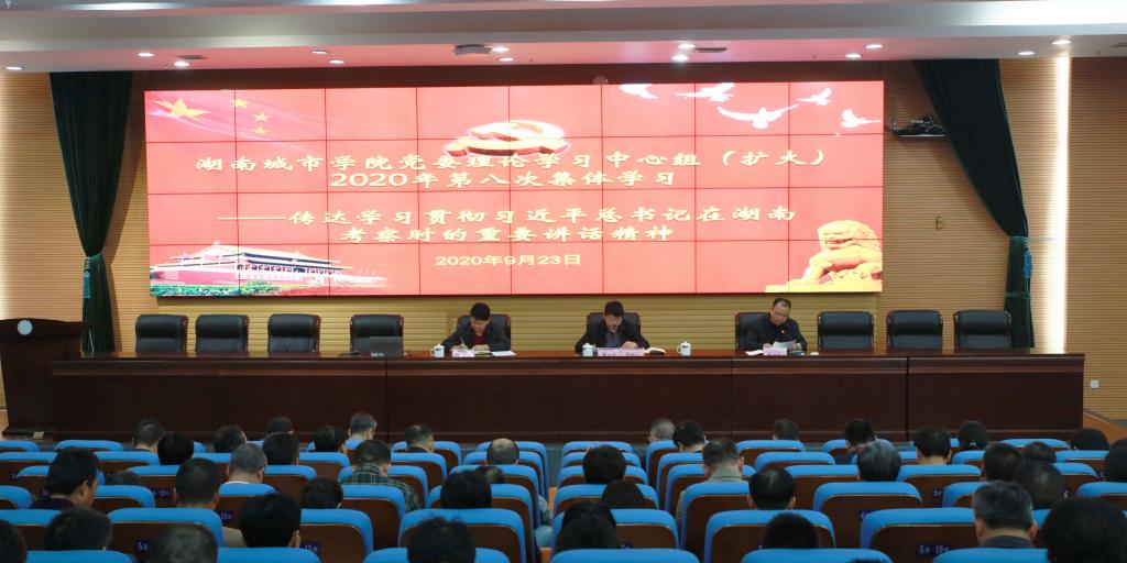 2020年9月23日,学校召开党委理论学习中心组(扩大)第八次集体学习,专题传达学习习近平总书记在湖南考察调研时的重要讲话精神和省委常委会扩大会议精神,全面部署贯彻落实工作,为奋力谱写新时代中国特色社会主义湖南新篇章贡献城院力量。校长李建奇领学了《习近平在湖南考察时强调:在推动高质量发展上闯出新路子 谱写新时代中国特色社会主义湖南新篇章》《湖南省委常委会扩大会议传达学习贯彻习近平总书记在湖南考察时的重要讲话精神》,党委副书记汤放华领学了《习近平:在基层代表座谈会上的讲话》。副处级(含)以上干部、学生辅导员、马克思主义学院全体教师参加会议。党委书记罗成翼主持会议并作重要讲话。